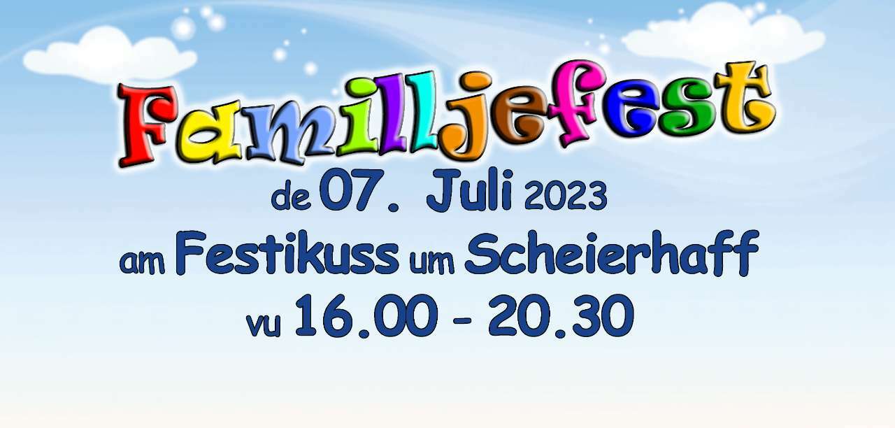 07.07.2023Le vendredi, 7 juillet 2023 le SEA de la Commune de Sanem (Service d’Education et d’Accueil, anciennement Maison Relais) organise sa fête traditionnelle de fin d’année scolaire «Familljefest 2023». La fête, à laquelle nous vous inviterons chaleureusement, se déroulera dans et derrière le FESTIKUSS (salle de fête en dessous du centre sportif au Scheierhaff à Soleuvre) à partir de 16h00.